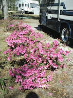 We didn't have any problems with the coach on the trip over. It ran like a top all the way to Gulf Shores. Not a hitch or hiccup. Chuck is so relieved that we have the problem fixed, for a while at least. I'm sure with a house on wheels there's bound to be a continueing saga of repair issues. We got to the RV park about 2:30 and got ourselves set up. I'm happy to report I have a huge pink azealia bush right outside my door and it's in full bloom. The park is not as nice as Eagles Landing but it will certainly do. There's a pond just a short distance from our coach that has at least 2 aligators in it and it's reported by our new neighbor that you can hear them croaking at night. He said they sound like huge frogs. I'm sure going to be anxious to hurry down there and check that out >> NOT! Well maybe we could drive the car down there and park with the windows cracked to listen.